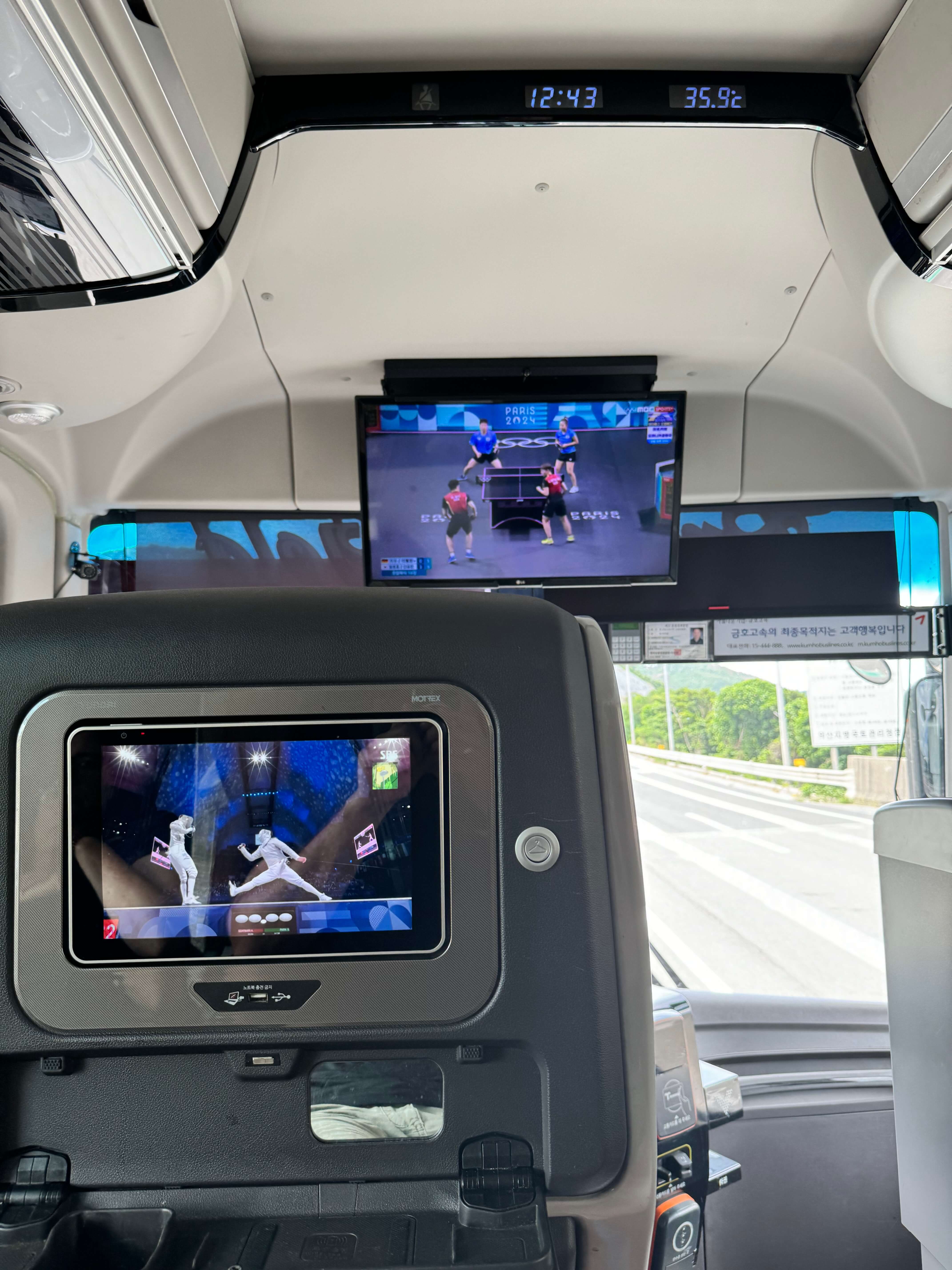 Nach einer angenehmen, etwa dreistündigen Busfahrt von Yeosu nach Busan, die uns mit ihrem Komfort positiv überraschte, kamen wir in der lebhaften Stadt an. Leider gibt es keine direkte Zugverbindung, aber die Busse sind sehr bequem und eine gute Alternative. Während der Fahrt nutzte ich die Gelegenheit, Olympia in Paris 2024 zu schauen. Lustigerweise lief gerade ein spannendes Tischtennisduell zwischen Südkorea und Deutschland – eine großartige Einstimmung auf unsere Ankunft in Busan.