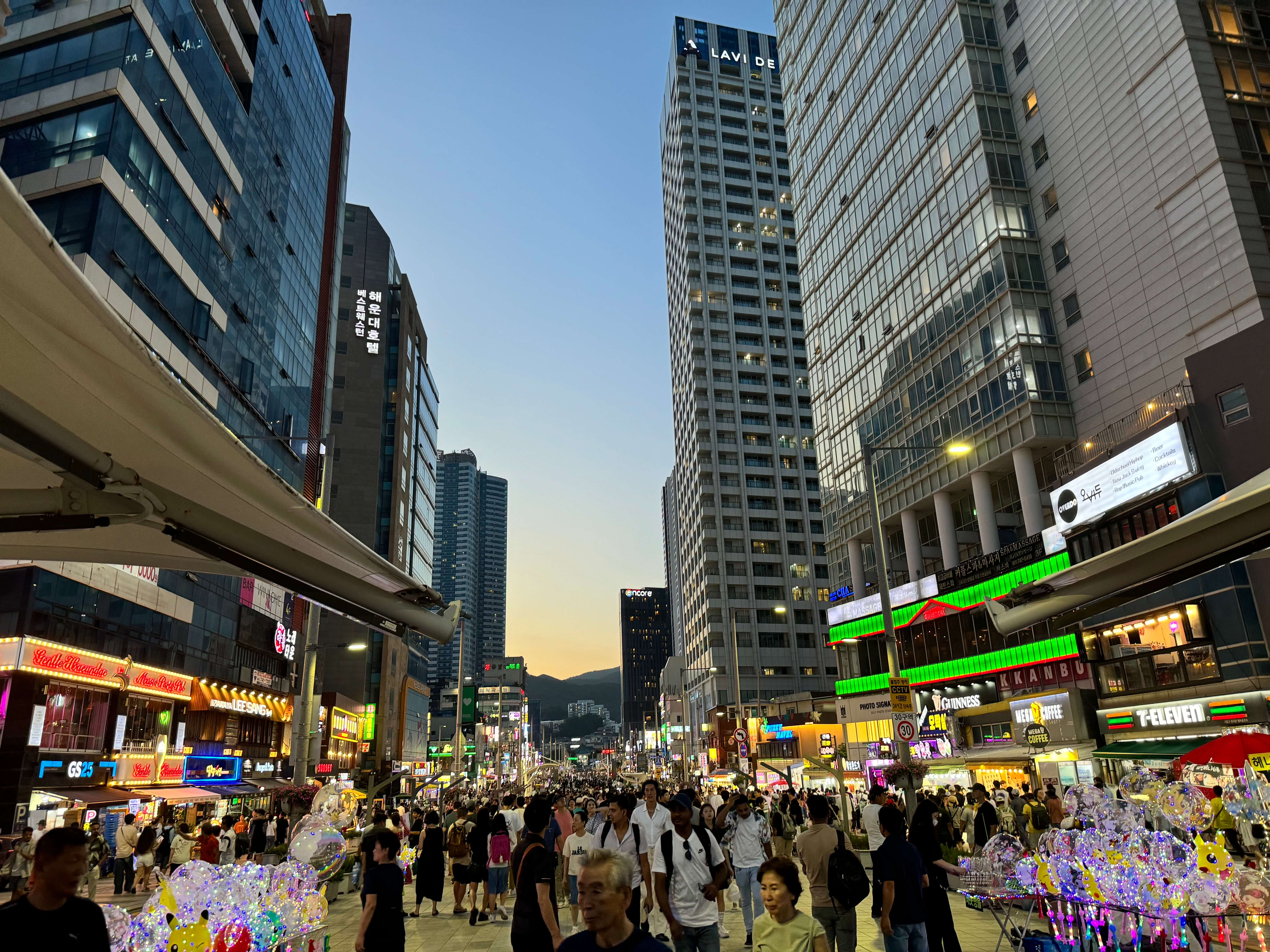 Doch im Vergleich zu den eher ruhigeren Zielen wie Mokpo und Yeosu fühlte sich Busan zunächst wie ein kleiner Kulturschock an. Plötzlich waren wir umgeben von einer Fülle an westlichen Touristen, die wir vorher kaum zu Gesicht bekommen hatten – und jetzt in rauen Mengen antrafen. Die Stadt war voll, hektisch und weiterhin von der extremen Hitze geprägt, die uns schon in den vorherigen Tagen begleitet hatte. Diese lebhafte und überfüllte Atmosphäre überforderte uns anfangs ein wenig, insbesondere nach den entspannten Tagen in den ruhigeren Regionen Südkoreas.